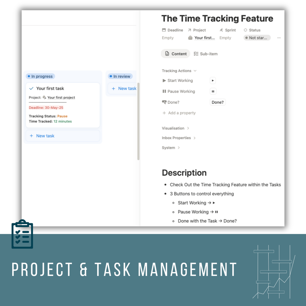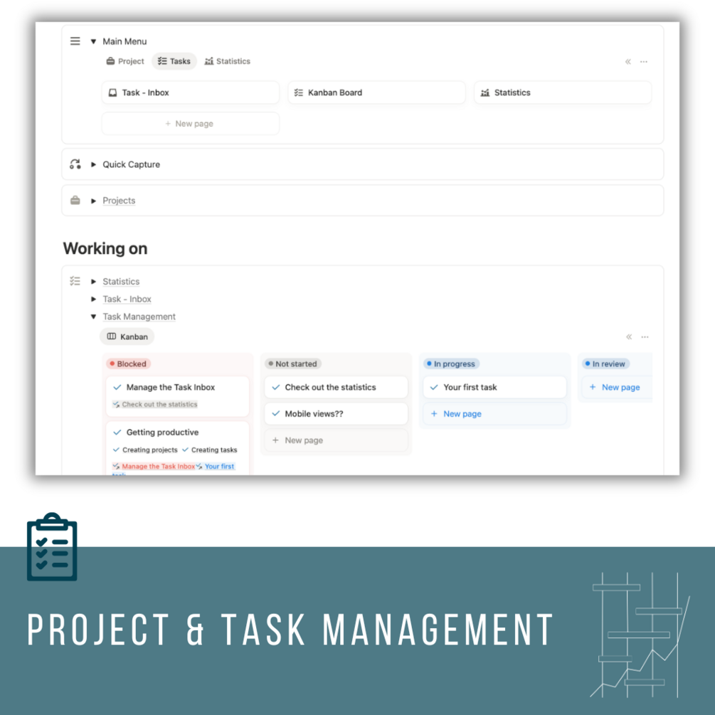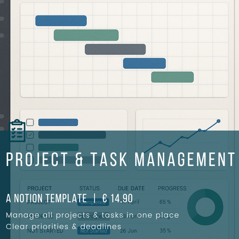 With this Notion project management template, you can bring structure, clarity and flow to your projects - whether solo projects, teamwork or business organization. Manage projects, tasks, deadlines and progress in one central location. Thanks to clever database links, Kanban boards and mobile quick-capture functions, you have everything under control - from the initial idea to successful completion.